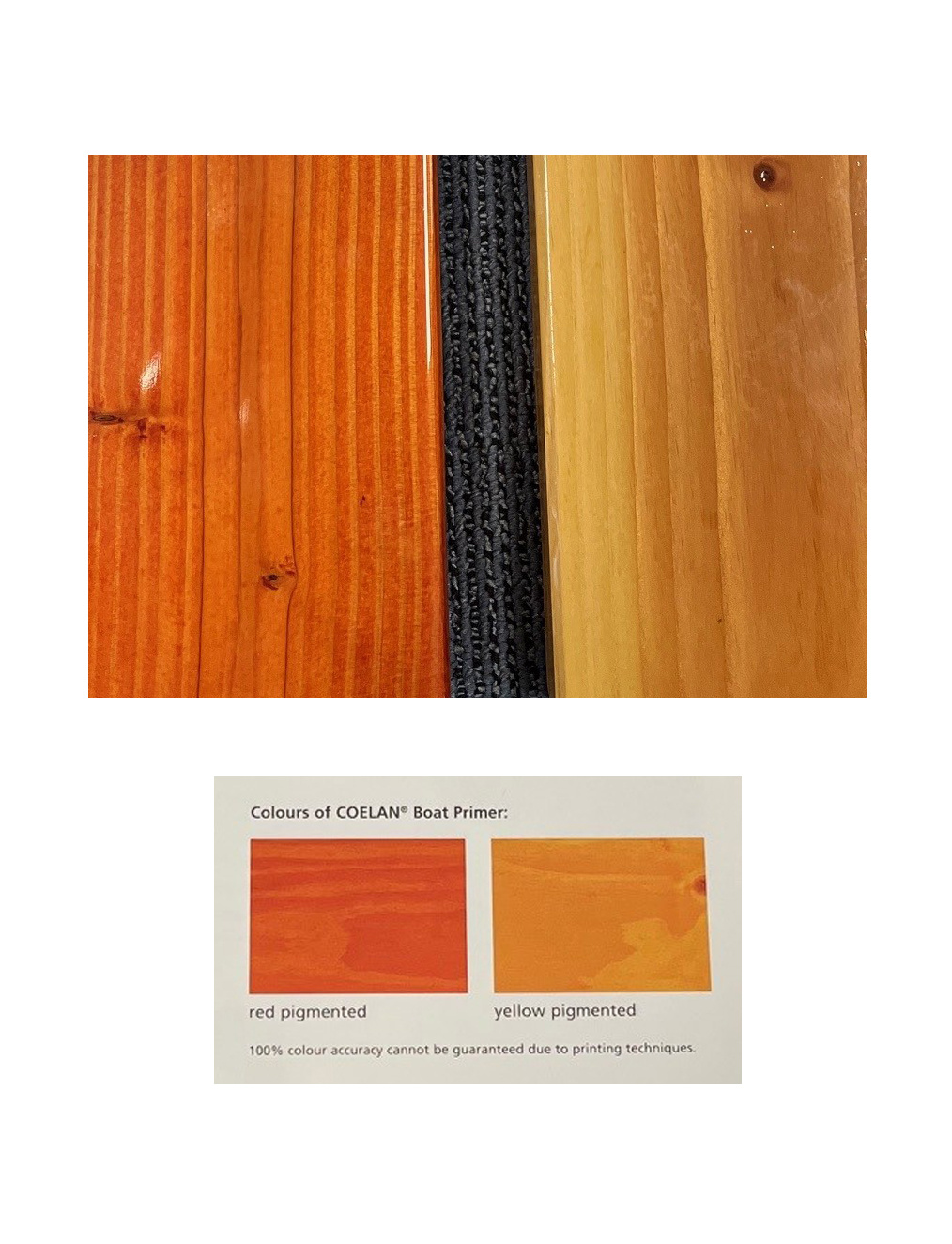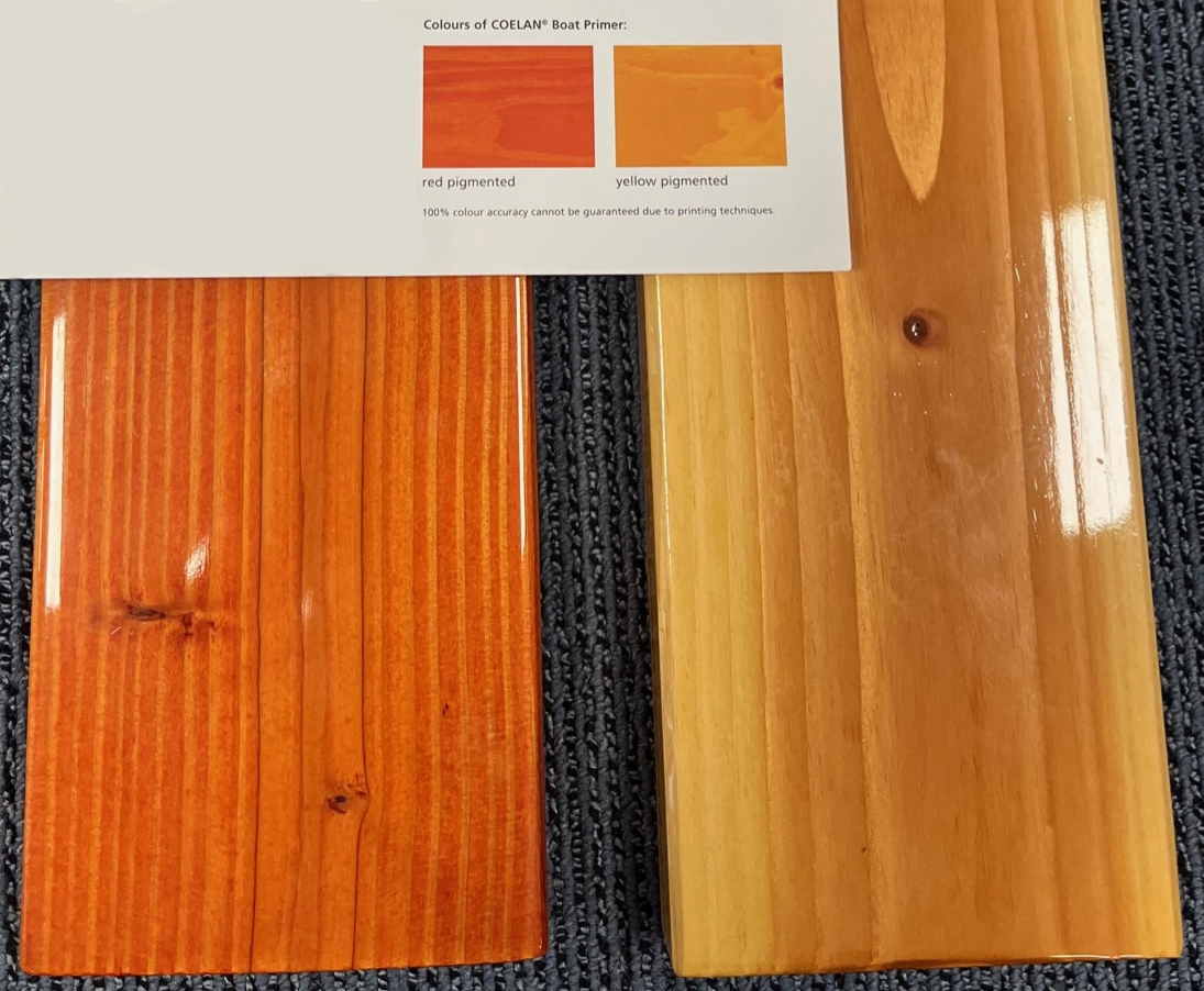 - Coelan heeft twee soorten primer: transparant (lichtgeel gekleurd) en gepigmenteerd (rood gekleurd). Deze rood gepigmenteerde primer is speciaal om mahonie hout en andere lichtgevoelige houtsoorten te beschermen tegen verkleuring. Breng na het schuren van de ondergrond de speciale primer aan in de kleur naar keuze (geel voor teak en rood voor mahonie). Breng daarna pas Coelan aan.